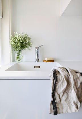 A clean and light, functional laundry space, with loads of storage. Including a sleek pull out basket, hanging rail and display shelving. Specs selected by our client.